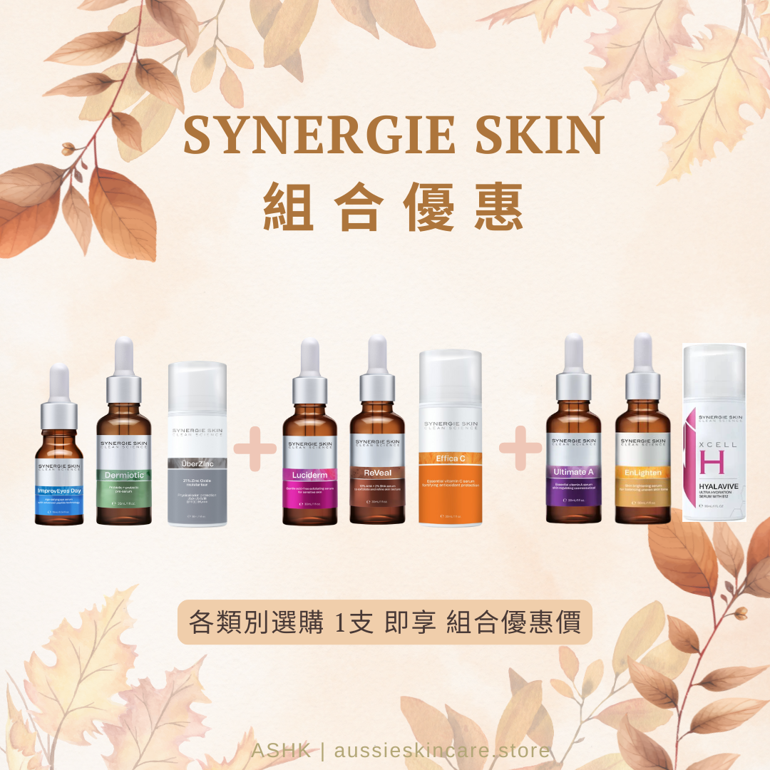 [組合優惠] Synergie Skin 科研精粹護膚組合 以下ABC類別選購各選 1支 即享 組合優惠價 A 類 Synergie Skin Dermiotic 益生菌+益生元肌底液 30ml $480 Synergie Skin ImprovEyes Day 抗皺眼部精華 10ml $480 Synergie Skin Uberzinc SPF30 PA+++物理防曬面霜 30ml $460 B 類 Synergie Skin Luciderm 無果酸溫和煥膚精華 30ml $760 Synergie Skin Reveal 溶黑頭精華 30ml $760 Synergie Skin Effica C 低敏提亮維C精華 30ml $760 C 類 Synergie Skin Ultimate A 維他命A晚間修護精華 30ml $900 Synergie Skin Enlighten 美白精華素 30ml $900 Synergie Skin XCELL H 絲絨超能三重修護精華 30ml $900 Synergie Skin PressPause 時光肌密露 30ml $945