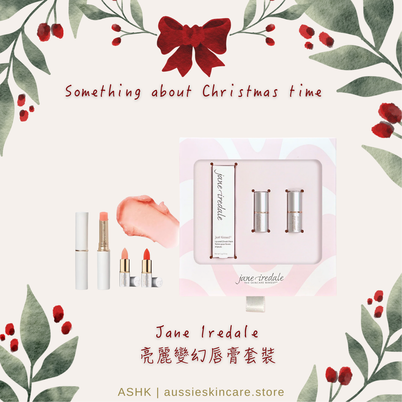 [聖誕優惠] Jane Iredale 亮麗變幻唇膏套裝 ***不參與買滿即賞 / 其他任何優惠*** 套裝包括: 玫瑰變幻唇膏(Forever Pink/Red/Peach/You) 3g 迷你玫瑰變幻唇膏(Forever Red) 1.5g 迷您玫瑰變幻唇膏(Forever Pink) 1.5g 皇牌變幻唇膏,為節日添加特別色彩 不用鏡子,輕快地一塗,屬於您的健康紅潤色彩漸漸出現,即時趕走灰暗蒼白 全球首創,以葡萄柚、橙、檸檬皮萃取的全天然成分 配合triisostearyl citrate 的皮膚柔潤劑來刺激皮膚上的酸性值而產生屬於自己的粉紅色彩,感覺自然,散發健康魅力,帶走蒼白 含珍貴大馬士革玫瑰蠟、橄欖油, 牛油果油及蜜蠟成分,注入營養水份,讓您的嘴唇柔軟滋潤,清香的紅石榴萃取,同時提供高度抗氧化能力,改善唇色。清香的紅石榴粹取,提供高度抗氧化能力 經皮膚科醫生測試,成分溫和天然,色彩亮麗持久,結合皮膚的反應,能創造出的天然粉紅色彩 更可當作胭脂使用,在胭脂位置塗上一點點後,用手指即時輕輕推勻,青春粉紅色彩即時散發